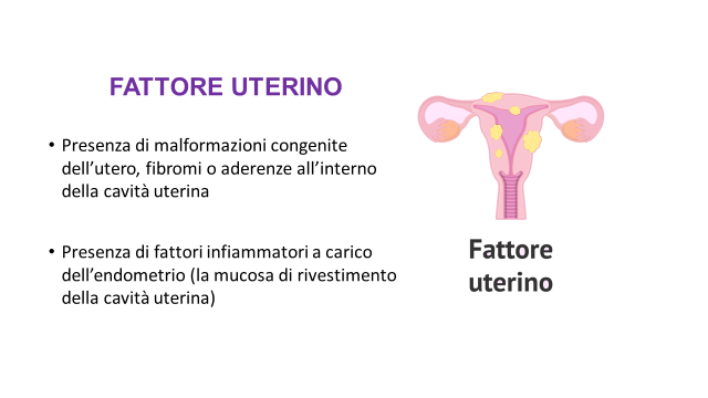 presenza di malformazioni congenite dell’utero, fibromi o aderenze all’interno della cavità uterina oppure presenza di fattori infiammatori a carico dell’endometrio (la mucosa di rivestimento della cavità uterina)